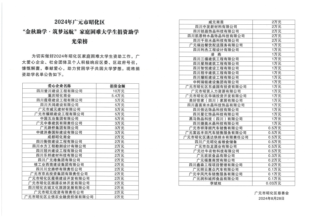 8月28日,昭化區(qū)舉行2024年“金秋助學(xué)·筑夢遠航”家庭困難大學(xué)生資助儀式,路橋集團作為資助企業(yè)參會并獲得表彰。