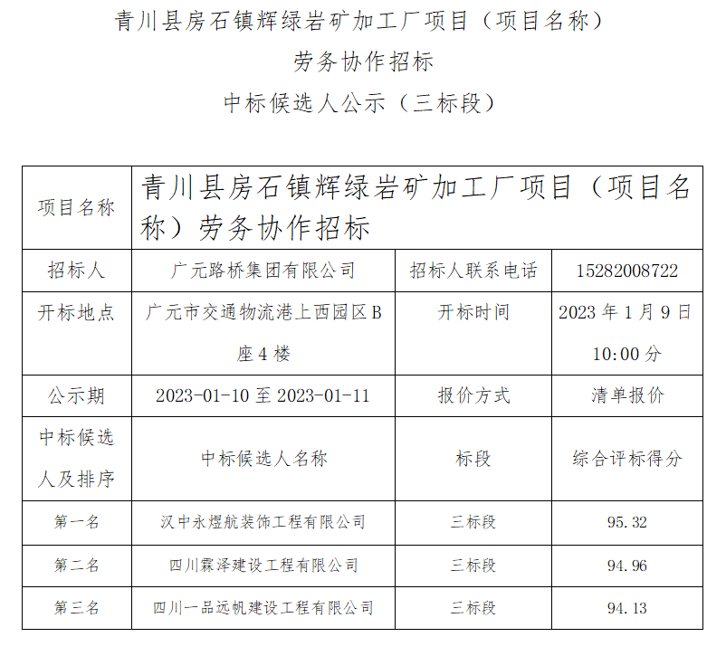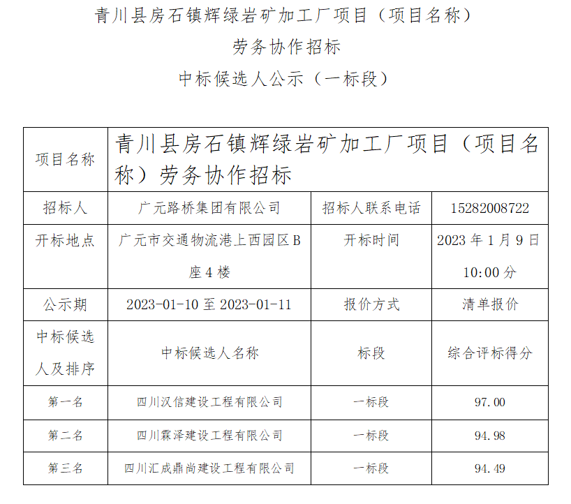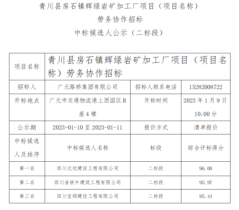 青川縣房石鎮(zhèn)輝綠巖礦加工廠項(xiàng)目(項(xiàng)目名稱(chēng)) 勞務(wù)協(xié)作招標(biāo)中標(biāo)候選人公示