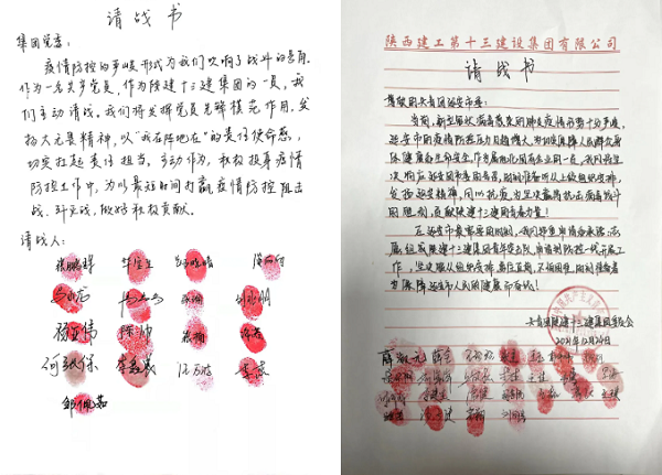 為了積極應(yīng)對(duì)嚴(yán)峻的疫情防控形勢(shì),在陜建十三建集團(tuán)黨委的號(hào)召下,全體黨員干部、團(tuán)員青年、90后、00后紛紛遞交請(qǐng)戰(zhàn)書,請(qǐng)?jiān)父耙痪€服務(wù)疫情防控工作,助力延安市打贏疫情防控阻擊戰(zhàn)、殲滅戰(zhàn)。