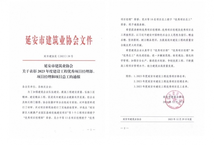 近日,延安市建筑業(yè)協(xié)會對2023年度建設(shè)工程優(yōu)秀項目經(jīng)理部、項目經(jīng)理、項目總工進(jìn)行了表彰。