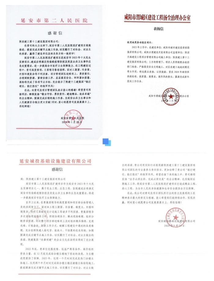 近日,集團(tuán)第二工程公司施工的延安市第二人民醫(yī)院改擴(kuò)建項目、咸陽渭城商務(wù)功能區(qū)項目收到建設(shè)單位發(fā)來的感謝信、表揚信,對集團(tuán)在項目高質(zhì)量建設(shè)中的傾情付出表示感謝,為項目團(tuán)隊在施工過程中表現(xiàn)出的敬業(yè)精神表示贊揚。