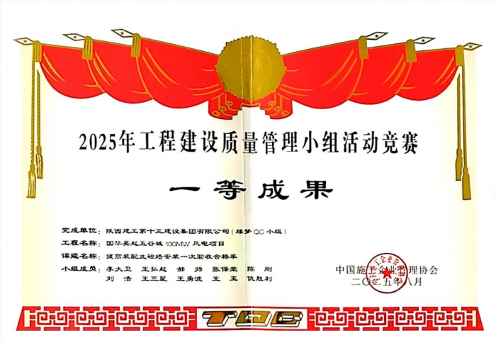 近日,中國施工企業(yè)管理協(xié)會公布了“2025年工程建設(shè)質(zhì)量管理小組成果大賽”獲獎名單,集團國華吳起五谷城100MW風電項目“緣夢QC小組”參賽成果《提高裝配式砼塔安裝一次驗收合格率》獲得大賽一等獎。